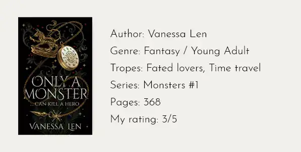 Only a Monster has a really cool and unique concept, where our MC is kind of the villain: she's one of the monsters who take time from the lives of humans to travel in time. And in this book, she's supposed to embrace her monstrousness to kill the hero. Except she's in love with him.